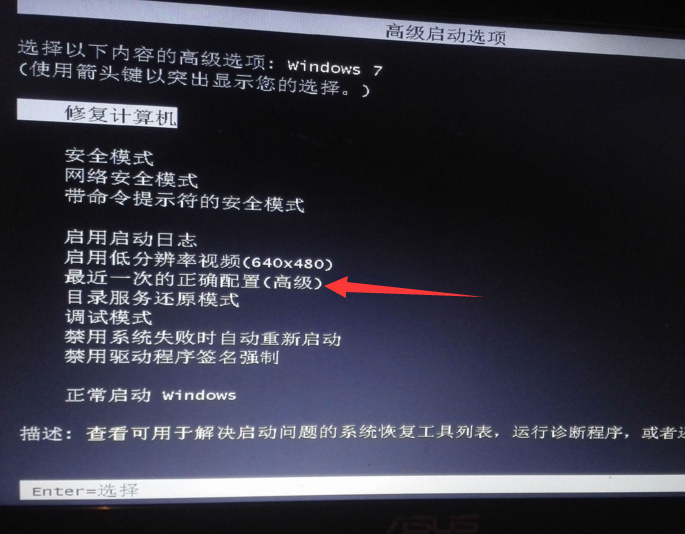 開(kāi)機(jī)時(shí)不停的按F8鍵就會(huì)出現(xiàn)高級(jí)啟動(dòng)選項(xiàng)菜單,接著選擇“最后一次正確配置”。